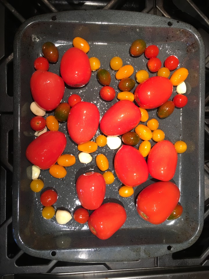 On a baking sheet place roma tomatoes, grape tomatoes and garlic. Coat with avocado oil and 1 teaspoon of salt, mix so tomatoes are fully coated with oil.