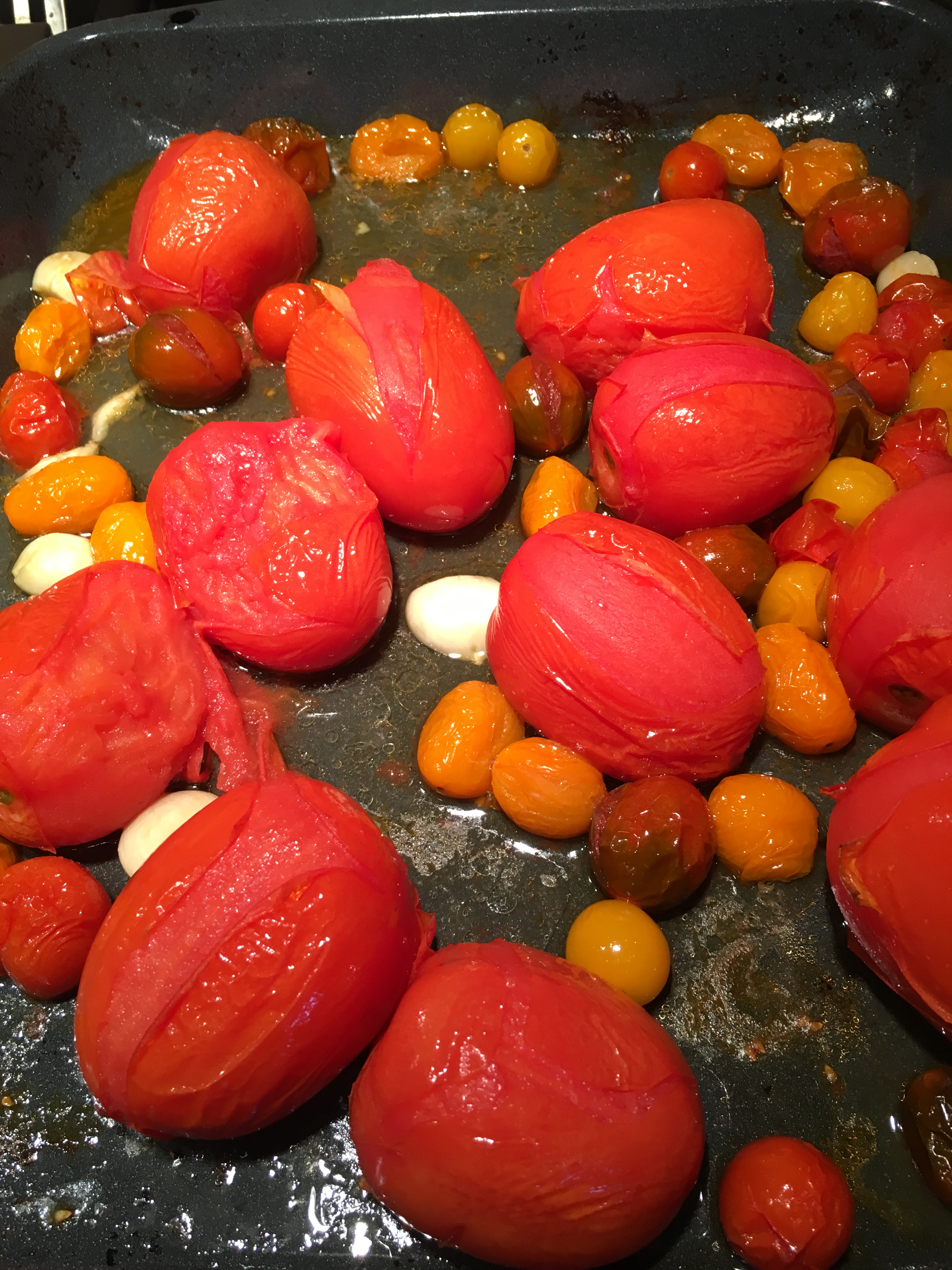 Bake for 25 minutes or until skins of tomatoes begin to peel and blister. (you need to keep an eye on your tomatoes, they may smoke).