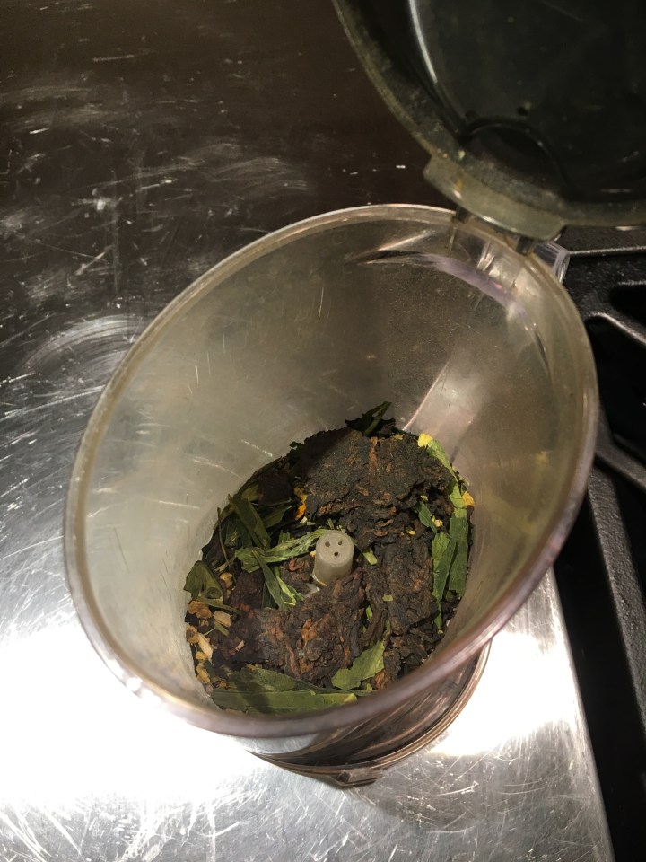 In a tea brewer or strainer mix together green, pu-erh, herbal and yerba mate tea.