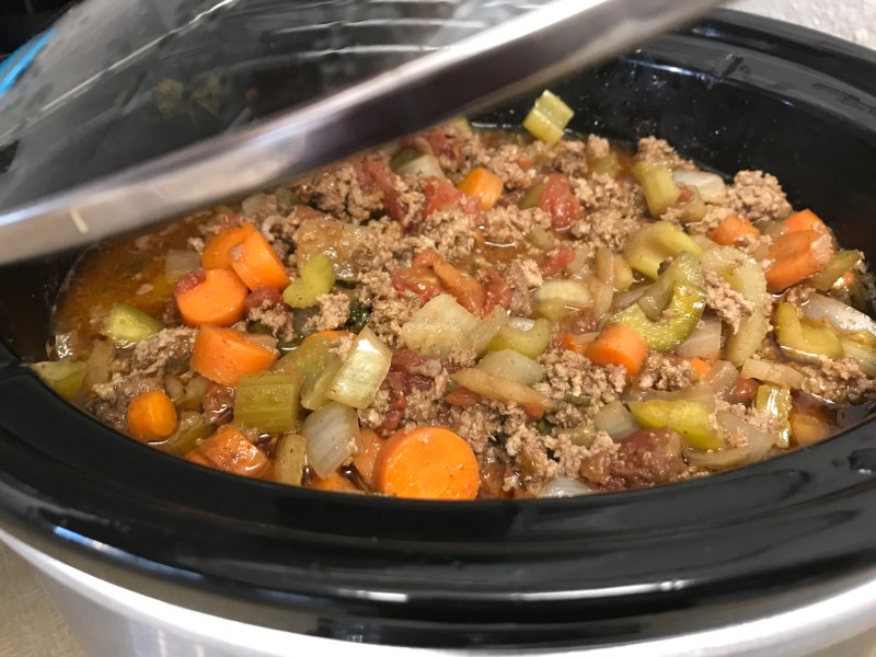 Chop the onion, carrots, celery and green pepper into thin dime-sized pieces, and add them to the crockpot.