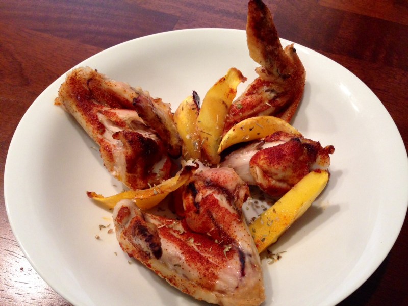 Place chicken on grill and cook for roughly 15 minutes (or until chicken is cooked thoroughly). Remove chicken from grill and slice into thin slices.