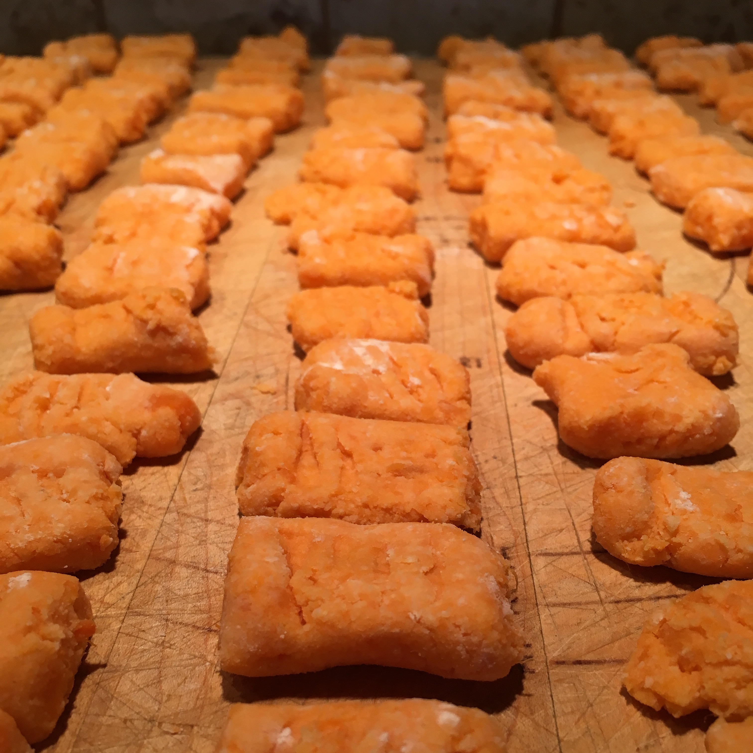 After your dough has formed, take small handfuls and roll out into a rope, cut into 1/2″ pieces. (If desired you can press lightly with a fork, to get a more traditional looking gnocchi. Or you can leave them as they are.)