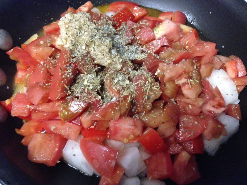 Add the onions and cook for about a minute before adding the tomato, garlic, Italian seasoning and salt.